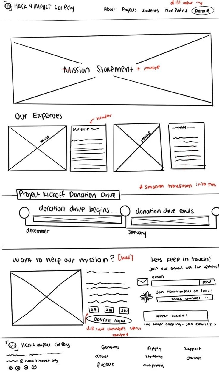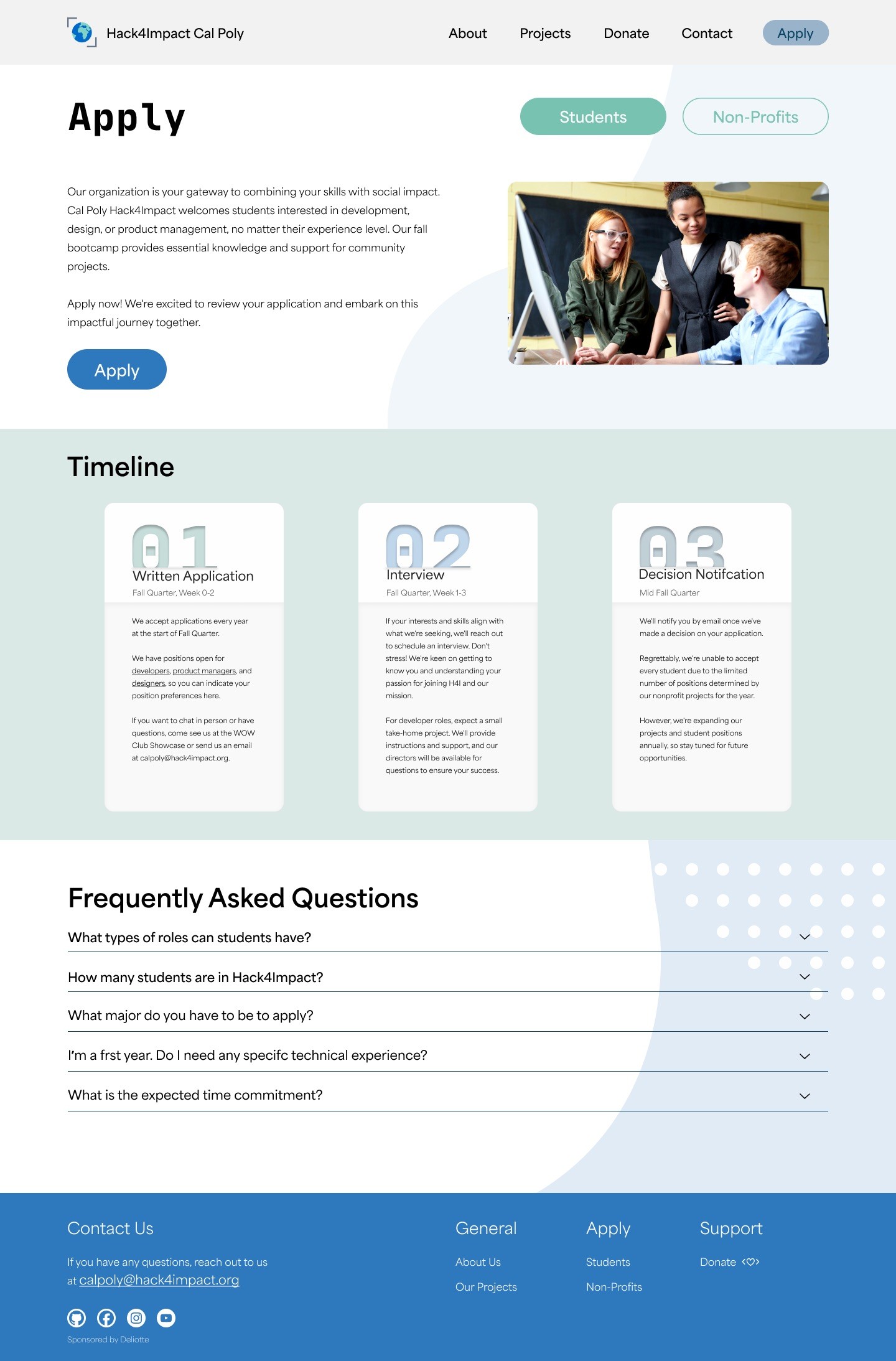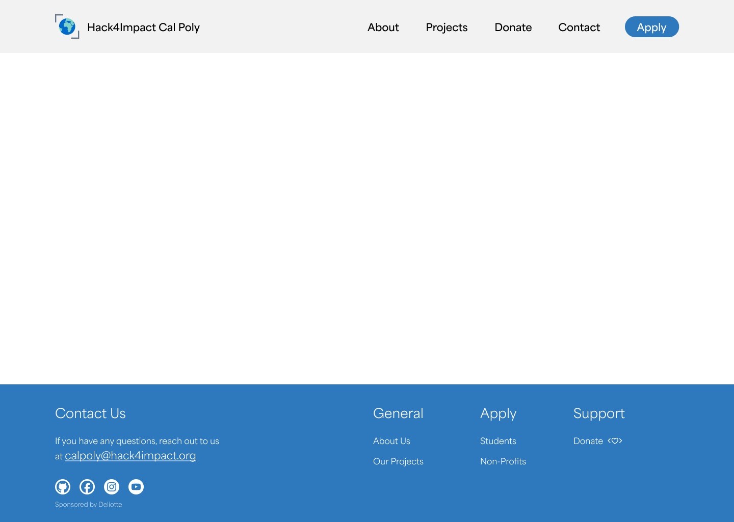 Our redesign focused on improving the user experience and navigation of the site to increase ease of use and functionality. It also utilized our updated design system that was created to reflect the Hack4Impact brand, while also incorporating aspects that are distinct to the Cal Poly SLO branch.
