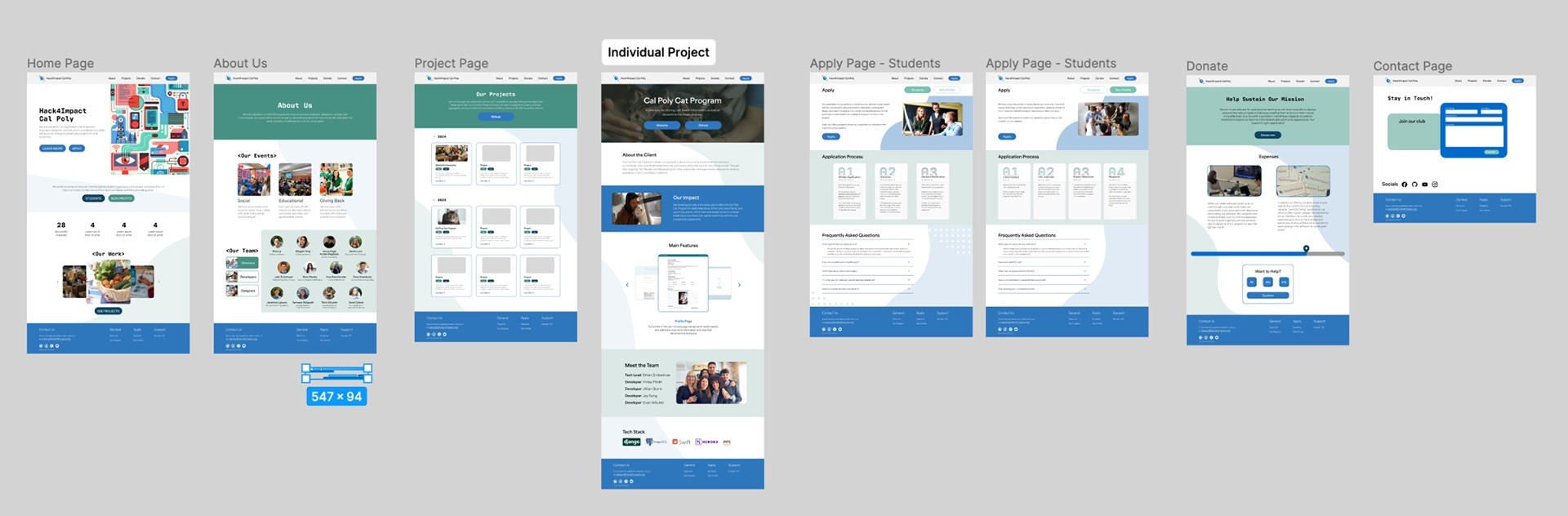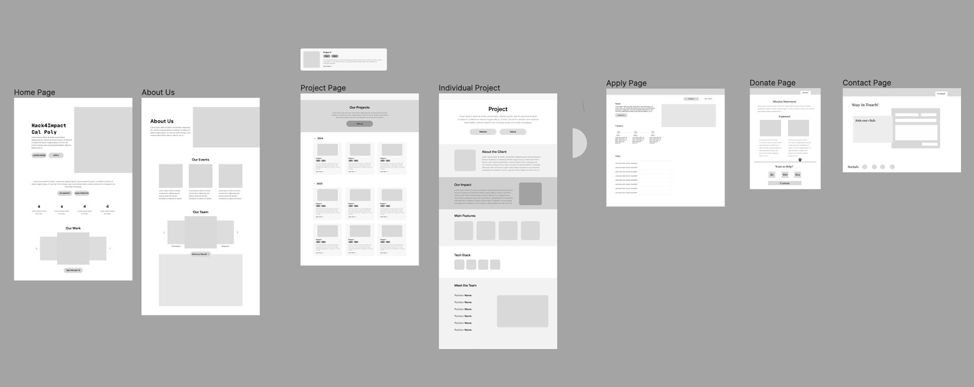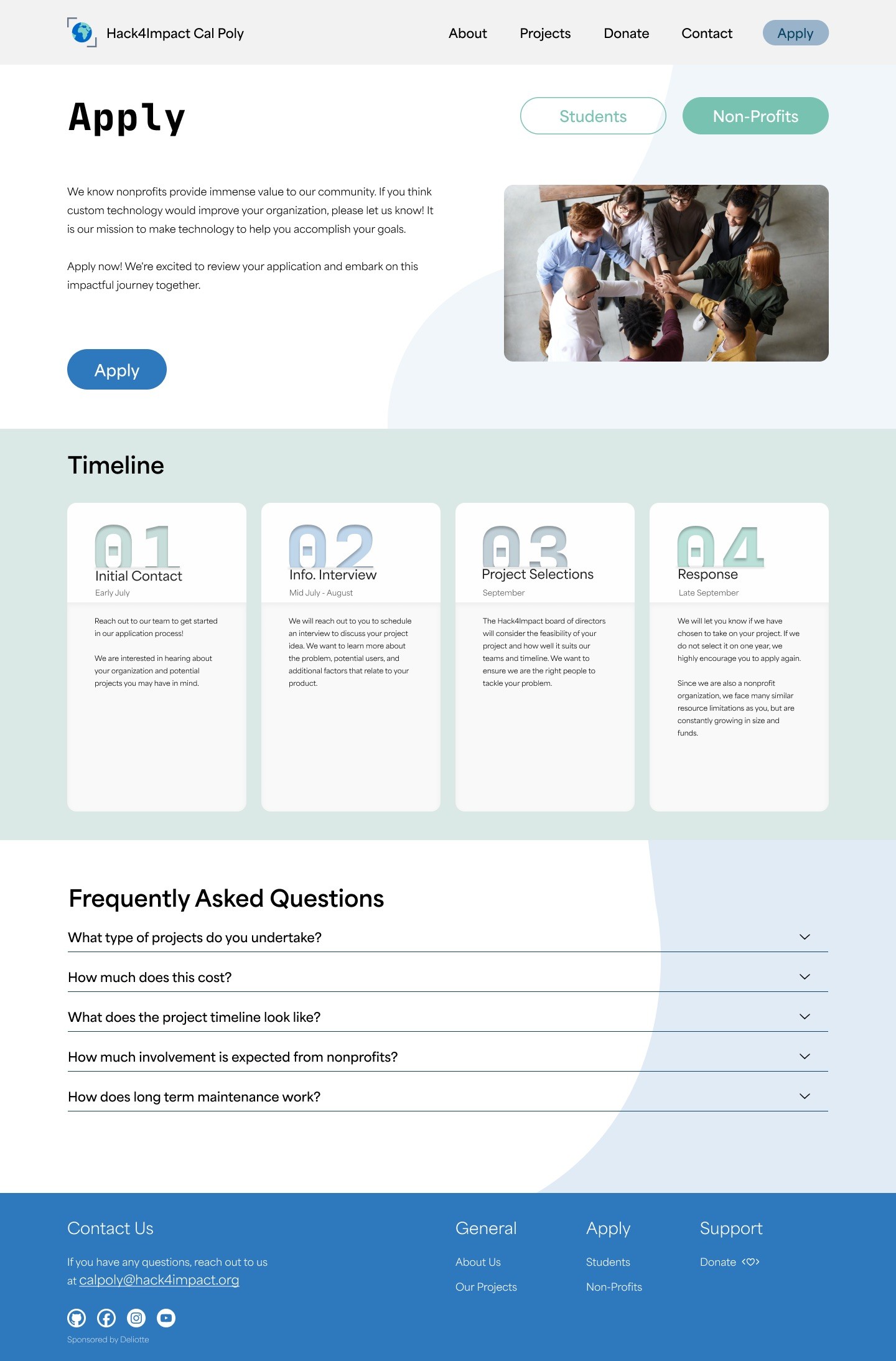 Our redesign focused on improving the user experience and navigation of the site to increase ease of use and functionality. It also utilized our updated design system that was created to reflect the Hack4Impact brand, while also incorporating aspects that are distinct to the Cal Poly SLO branch.