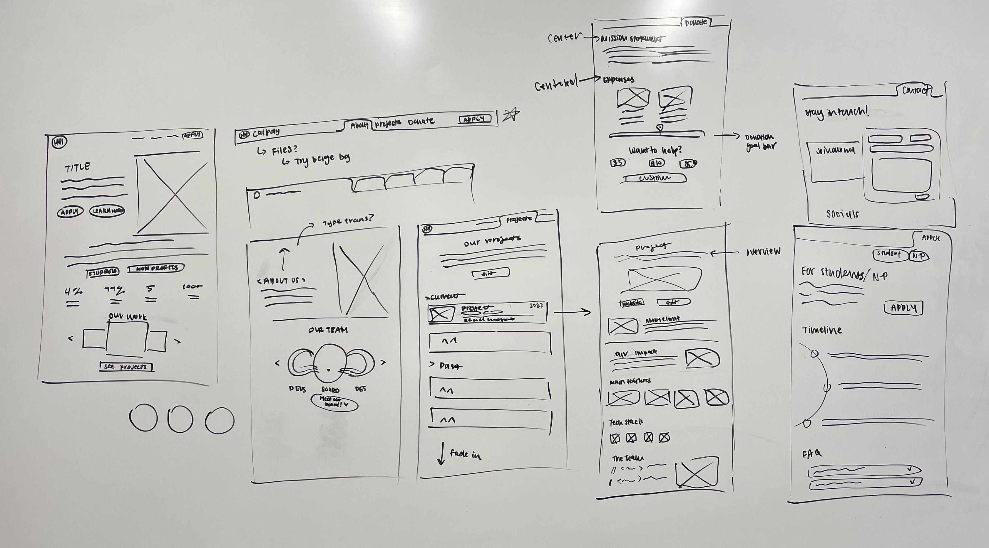Our process involved splitting website pages amongst our team members and doing quick storyboard sketches. This helped us visualize what we wanted the site to look like as a whole, and ensured that we were all on the same page in terms of visual elements.